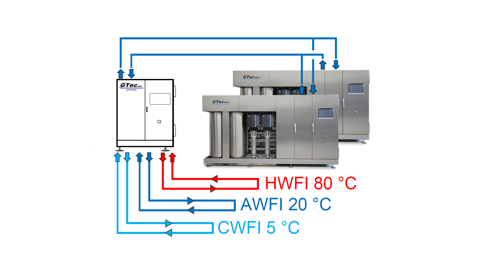 Nutzen Sie Ihren Reinstwasser Erzeuger immer noch zum Befüllen eines Lagertanks? Stellen Sie WFI per Destillation her und kühlen es anschließend wieder ab? Benötigen Sie hierfür viele komplexe Systeme, die aufwendig zu unterhalten sind? Dann wird Sie unsere zukunftsweisende Lösung mit Sicherheit interessieren. Stellen Sie sich vor, dass Ihre membranbasierten WFI-Erzeuger zusammen ein integriertes Ringsystem nutzen, von dem aus neben gewöhnlichen Lagertanks auch Point of Use Abnahmen versorgt werden. Durch Heiz-, Kühl- und Energierückgewinnungssysteme können zusätzlich Abnahmen von Heiß- und Kalt-WFI im integrierten Verteilsystem realisiert werden. Und das volumenstromgeregelt für jede Zapfstelle.