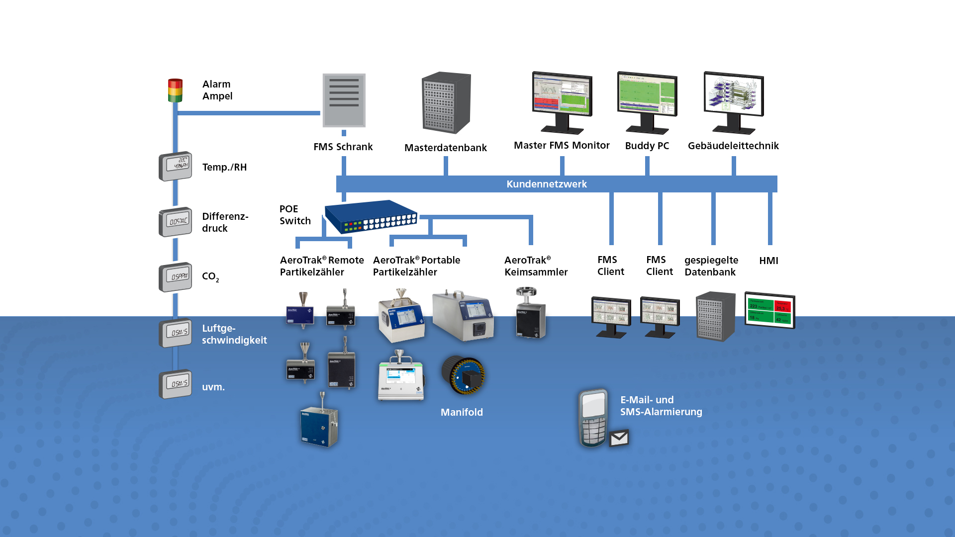 Dazu zählen Partikelzähler, Komplett-Lösungen im Bereich der Reinraum-Monitoringsysteme, Volumenstrom-Messhauben, Temperatur- / Feuchtemessgeräte, Luftgeschwindigkeitsmessgeräte, Differenzdruckmessgeräte, Probenahmepumpen, Staubmessgeräte und Zubehör.
